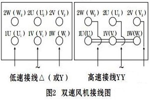 2.雙速風(fēng)機(jī)接線方法:本廠雙速風(fēng)機(jī)所配雙速電機(jī)其定子繞組為△/YY(或Y/YY)接法。接線圖如圖2所示: